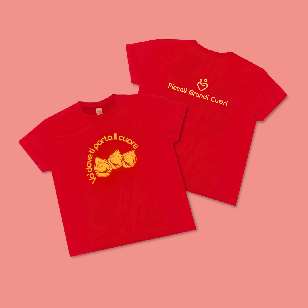 Maglietta rossa con disegno ‘Va’ dove ti porta il cuore’. Logo Piccoli Grandi Cuori sul retro.
