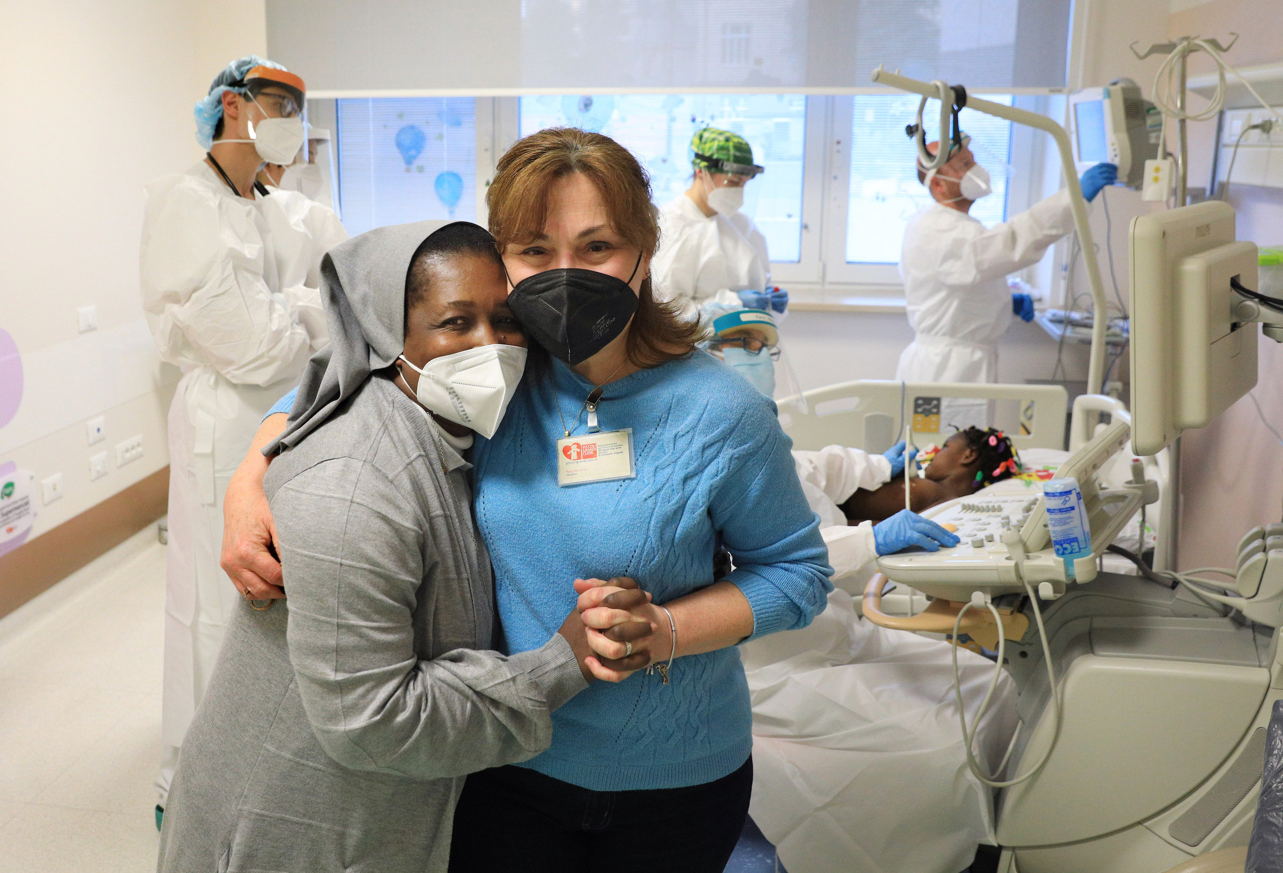 La nostra associazione è stata fondata da mamme e papà che hanno vissuto l’esperienza di un figlio cardiopatico congenito. In questo caso la famiglia di Mia è suor Rosalie, che resterà con lei per tutto il periodo di cura.
