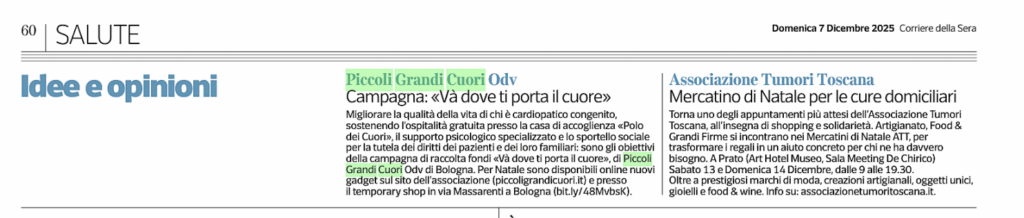 In Italia oltre 100 mila persone vivono con una cardiopatia congenita, malformazioni presenti fin dalla nascita che richiedono un percorso di cura lungo e complesso, che dura per tutta la vita. Scegliere un dono solidale di Piccoli Grandi Cuori significa trasformare un oggetto in un vero e proprio atto d’amore, contribuendo a migliorare la qualità della vita di chi è cardiopatico congenito. Il 100% di ogni donazione sarà utilizzato per sostenere progetti essenziali come: l’ospitalità gratuita presso la casa di accoglienza “Polo dei Cuori”, fondamentale soprattutto per chi non ha un posto dove stare durante i ricoveri e le lungodegenze (come per i trapianti di cuore); sedute di arteterapia e supporto psicologico per i bambini e le bambine ricoverate in Ospedale; viaggi in taxi gratuiti per l’Ospedale.Per maggiori informazioni contattare: info@piccoligrandicuori.it – tel. 347 4600887 – www.piccoligrandicuori.it