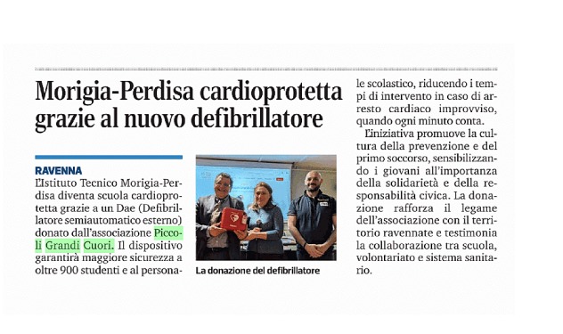 • “Ravenna. “Scuola ‘cardioprotetta’: l’associazione Piccoli Grandi Cuori dona un DAE al Morigia-Perdisa”: leggi l’articolo su clicmedicina.it