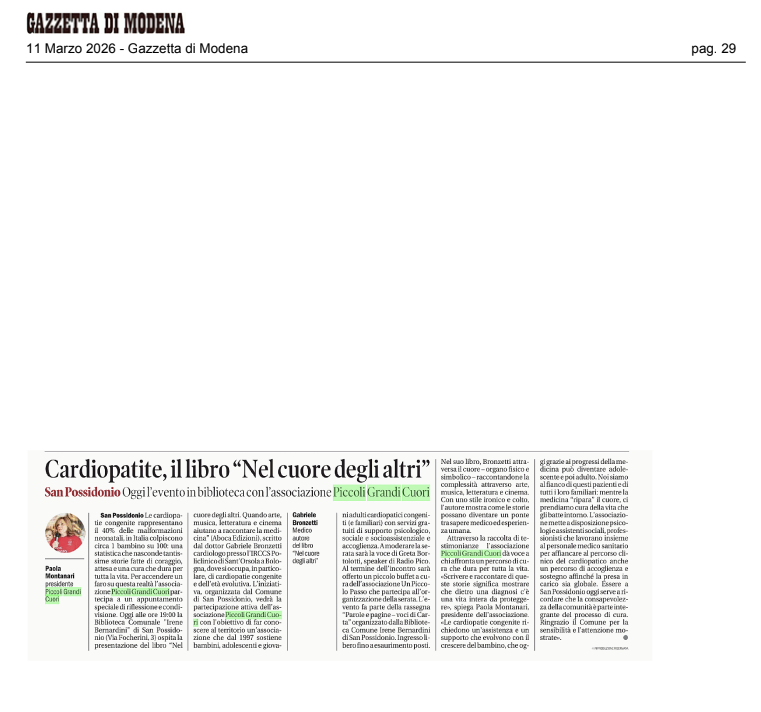 - “Cardiopatie congenite, l’11 marzo a San Possidonio l’incontro con il cardiologo Gabriele Bronzetti e Piccoli Grandi Cuori”: leggi l’articolo su www.modena2000.it